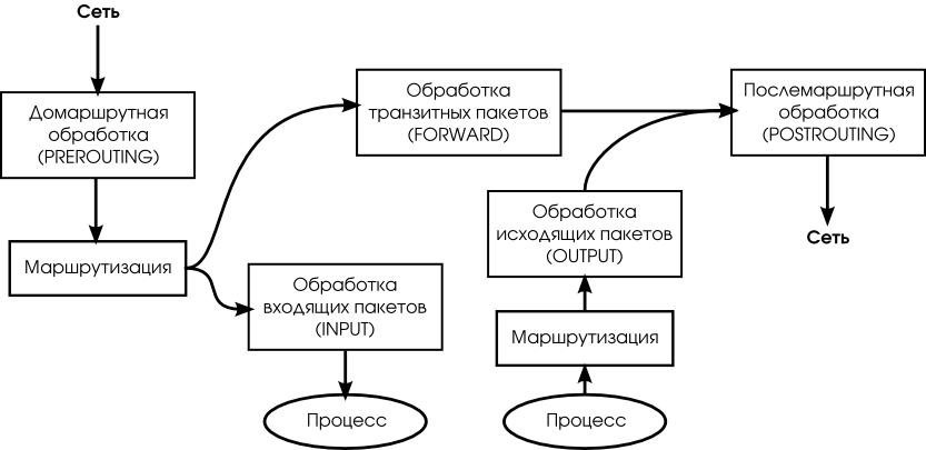 Суть iptables в следующем. Обработка сетевого пакета системой представляется как его конвейерная обработка. Пакет нужно получить из сетевого интерфейса или от системного процесса, затем следует выяснить предполагаемый маршрут этого пакета, после чего отослать его через сетевой интерфейс либо отдать какому-нибудь процессу, если пакет предназначался нашему компьютеру. Налицо три конвейера обработки пакетов: «получить – маршрутизировать – отослать» (действие маршрутизатора), «получить – маршрутизировать – отдать» (действие при получении пакета процессом) и «взять – маршрутизировать – отослать» (действие при отсылке пакета процессом).